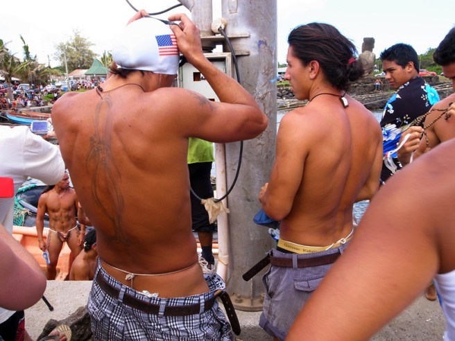2月6日 – 這是最後半天的駕車遊,我們六時多就開車去島北面有十數個魔埃的地方Tongariki看日出,一開始有些雲擋著日出,看了一會還下起大雨,我們就回到車上等雨停下來。過了十五分鐘,差不多所有一開始看的人都走了,我們重新走到魔埃,這時候雲少了些,還讓我們看到太陽慢慢升上來,雨過天晴後的彩虹也出現了,真的很開心。還有兩個小時,我們就遊了最後兩個最重要的景點Rano Raraku和Orongo,之後就回營地去。往後的兩天,我們由雙人房轉到帳幕去,這個旅程的第一次,在中午的烈日下有點熱,正好下午有個水運會,我們就出去走走,又看到很多肌肉男。