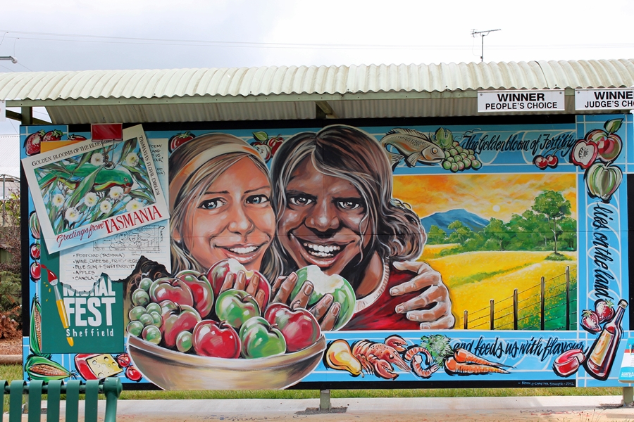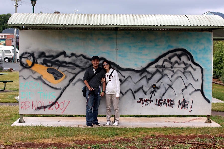 對華人來說,一定要去找Eason Chan來這裡畫的一幅壁畫。我們一問旅客中心的人,他們就知道我們要找這一幅。看來很多人也來問過。這是在畫坐直升機遊Cradle Mountain嗎?