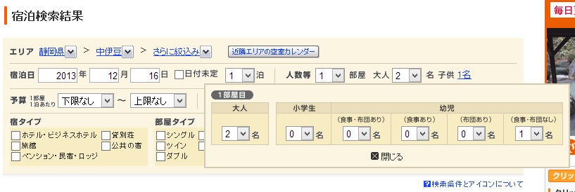 按下"こだわり条件あり"會出現最右手面的選項。這些選項十分有用,尤其是帶著小朋友去旅行。