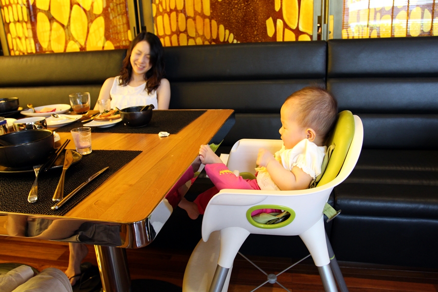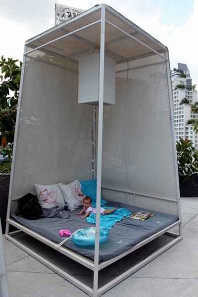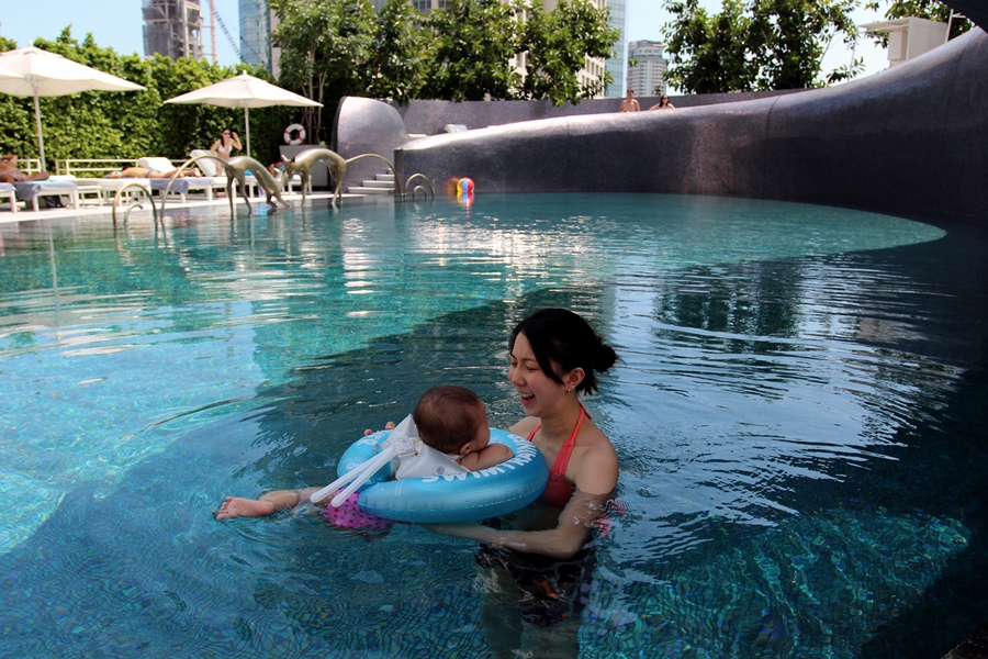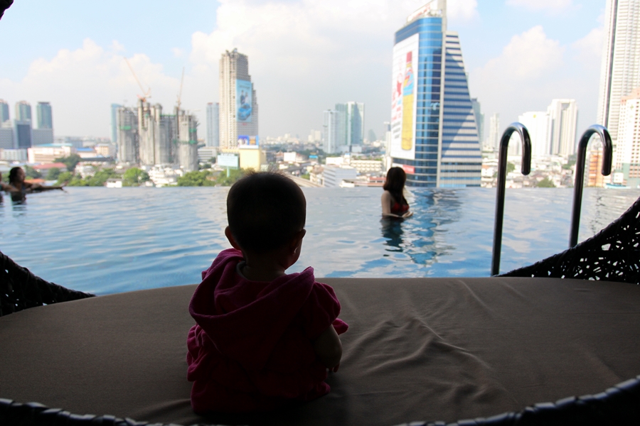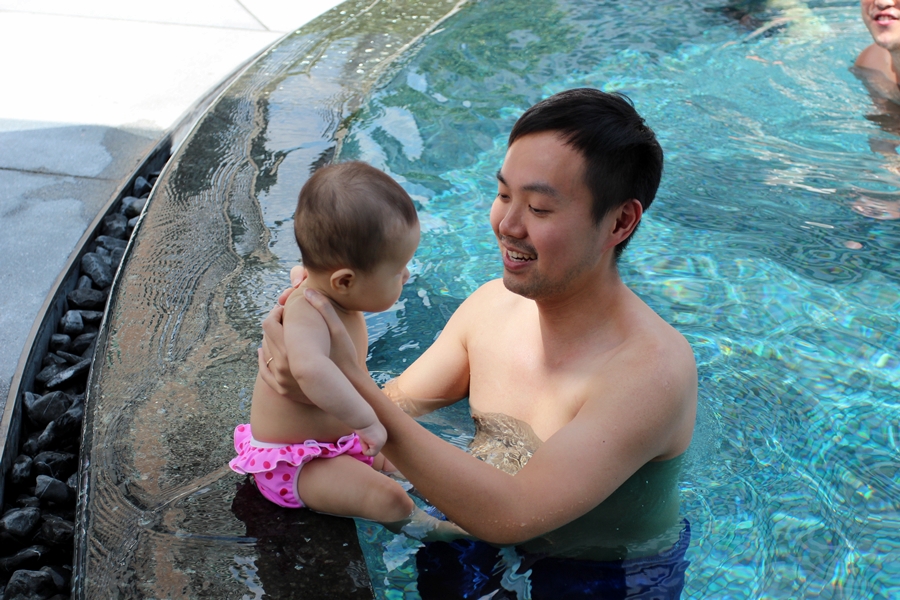 泳池是Infinity Pool,有專門曬太陽的椅,也有防曬的包廂。霖霖怕曬,所以就坐在包廂內看風景。還跟來自韓國的姐姐學游泳。