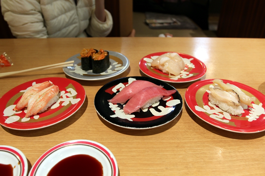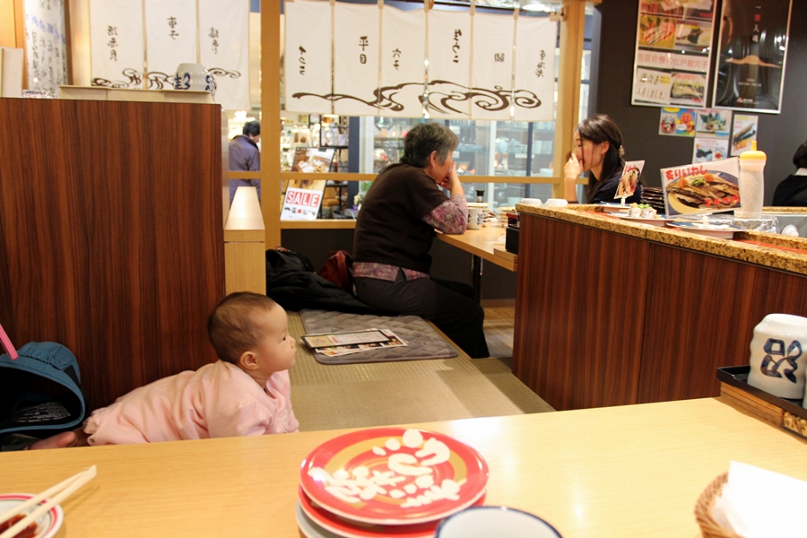 來到橫浜是大約中午1時左右,由於不想太趕,所以放棄了去御殿場,直接到橫浜去。第一步當然是要去填飽肚子。日本有不少餐廳當看到你帶著小朋友就會按排比較好的位置,就好像這家迴轉壽司店的一些座位是比較寬闊,可以安全地讓小孩躺著和趴著。