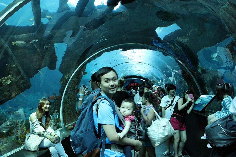 穿過了海底隧道,就來到了兩層樓般高的珊瑚礁。我們也休息一會,坐在地上望著魚兒游來游去,也給霖霖喝水和吃餅乾。