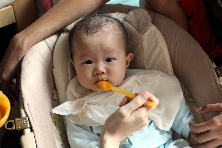 在五個月大時定時加入一餐米糊或食物蓉,這讓我們發現她其實也很愛吃,只是不喝奶。