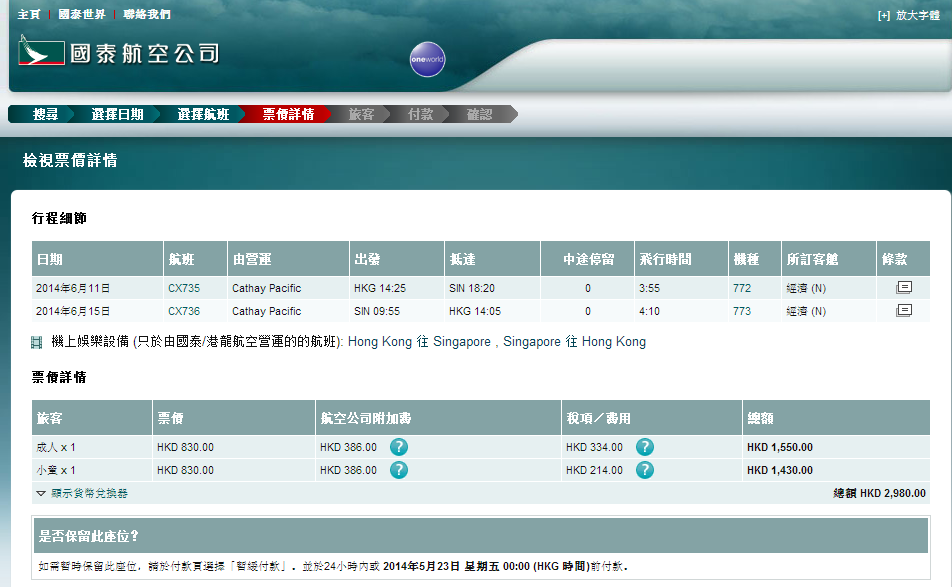 四月份時去新加坡,我買的嬰兒票要1400 HKD,跟上圖的小童票只差數十元。