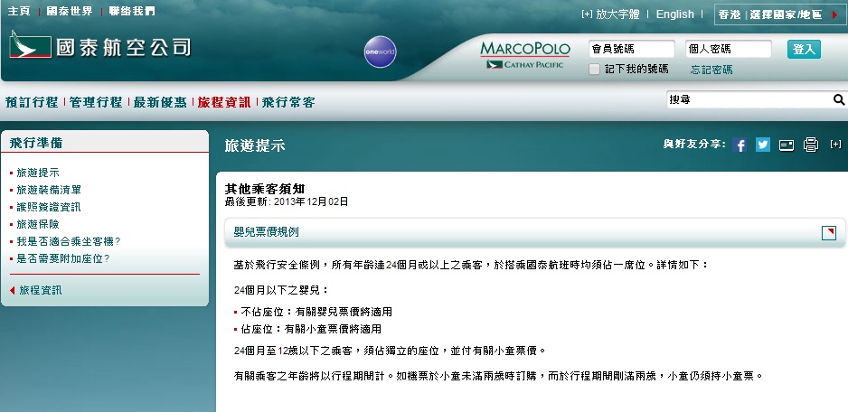 1. 兩歲以下的小孩要佔座位就要買小童票。而且不一定要透過熱線去買,可以直接在國泰網站買。