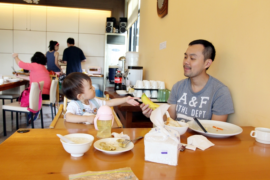 飯店早上通常有早餐,這些早餐都有粥,飯和菜,所以我們都會拿多一點放在暖壺內給霖霖中午時吃。