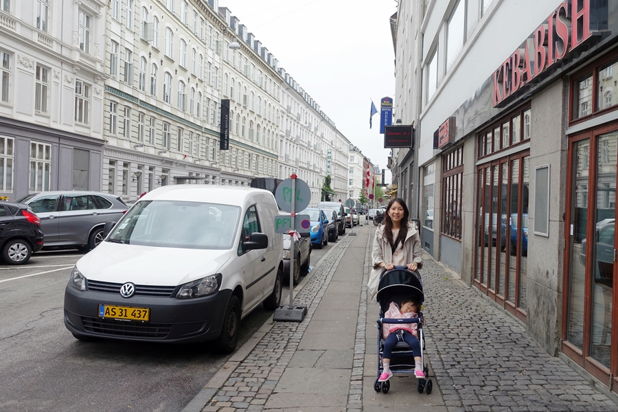 酒店在車站大約走十分鐘的不遠處。哥本哈根的人行道很寬敞,推著BB車走還OK,不過就要小心單車,避免走到單車道上。