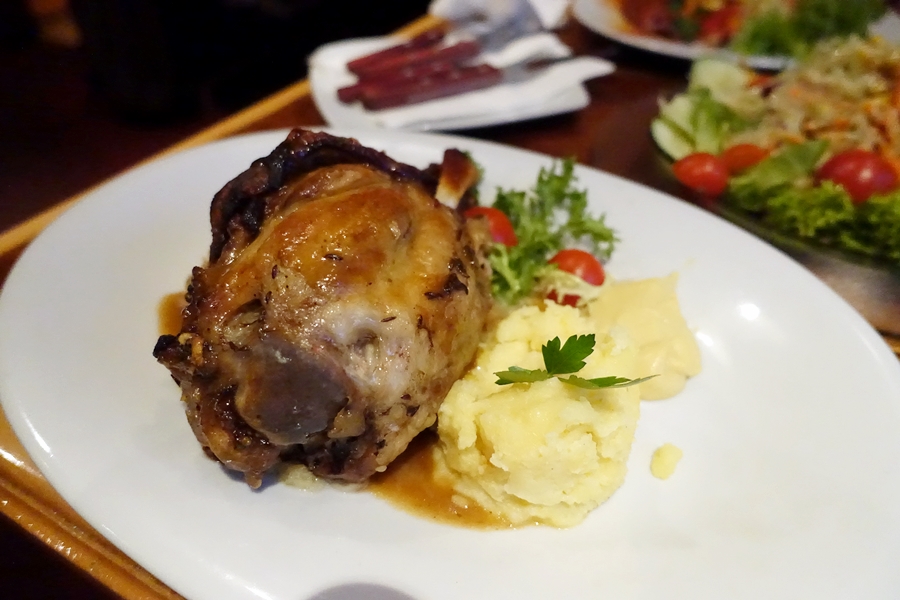 烤豬手配薯蓉很美味。