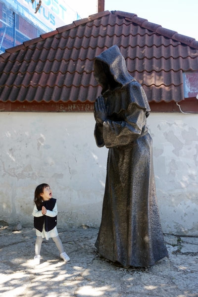 我們就叫霖霖走去和這僧人銅像拍個照擺個pose,結果……….