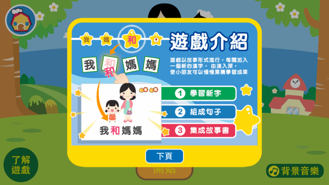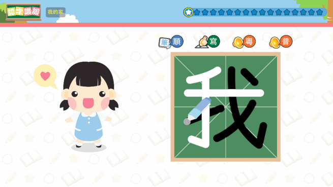 學習新字時會有動畫示範這個字怎樣寫,小孩然後要跟著筆順去寫,才能過關。