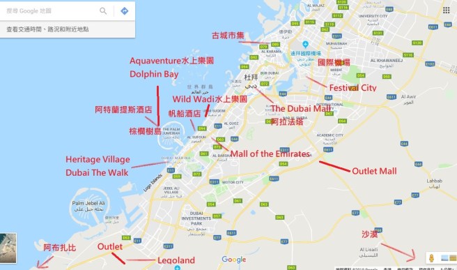 再往西南,就是第二大商場Mall of the Emirates, 而對出海邊就是帆船酒店,Madinat Jumeirah等有名酒店。